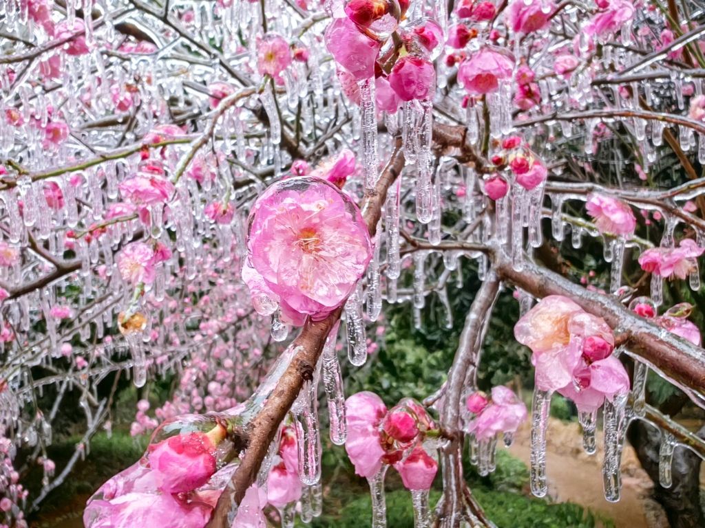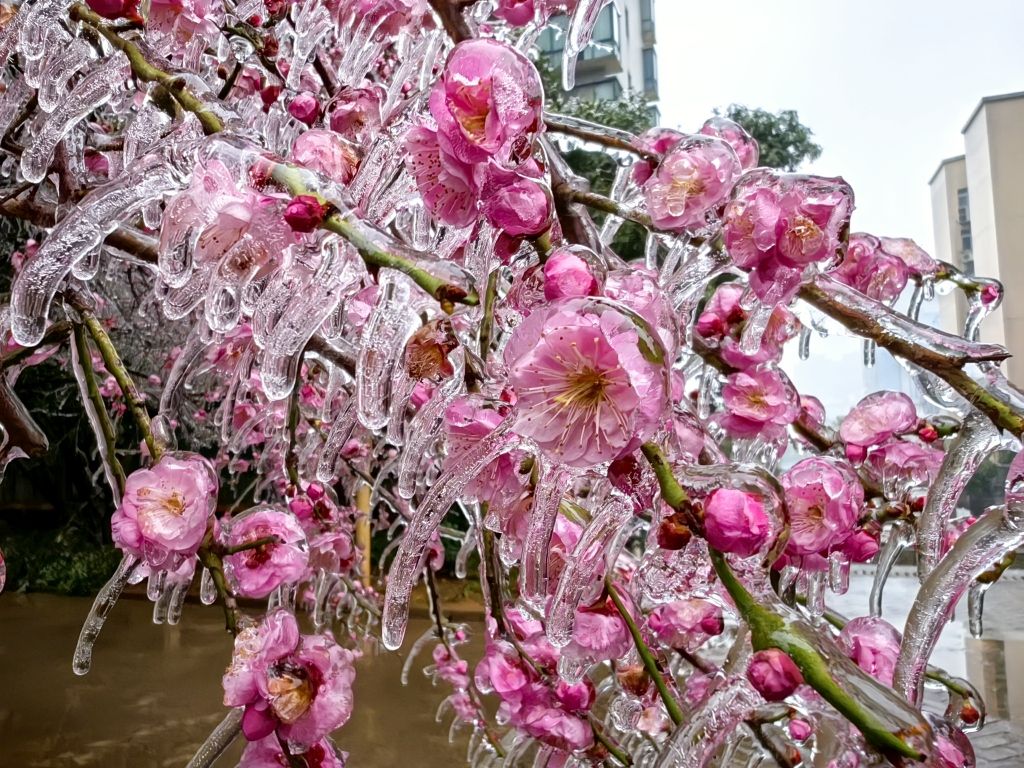 2024年2月7日,长沙,一夜冻雨后,街头梅花结冰。