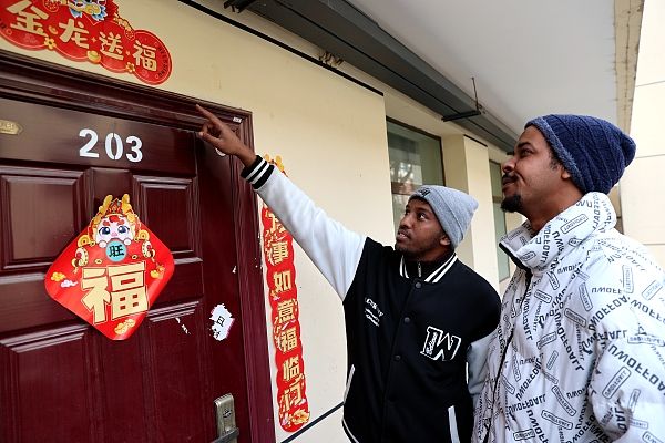 2024年2月7日,西宁市青海民族大学内,厄立特里亚留学生范达(左)和苏丹留学生李小飞(右)一同交流春联内容。当日,该校的留校留学生在宿舍门前贴春联,送祝福,感受中国春节氛围。