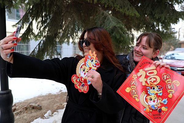 2024年2月7日,西宁市青海民族大学内,土库曼斯坦留学生苏娜(左)和挪威留学生丽莎(右)在自拍留念。当日,该校的留校留学生在宿舍门前贴春联,送祝福,感受中国春节氛围。