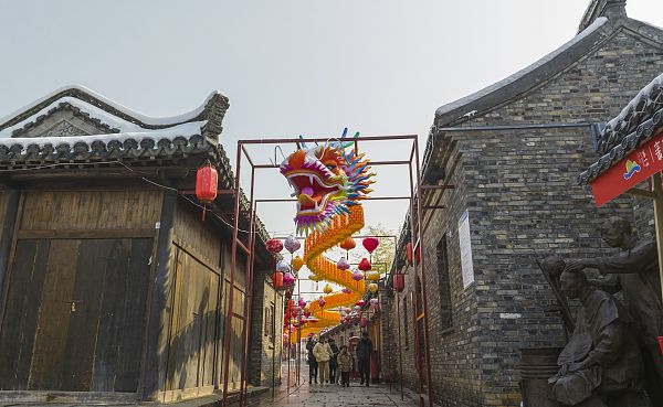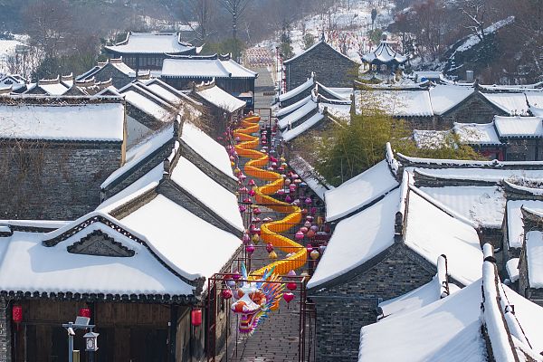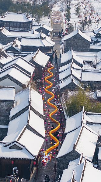 2024年2月7日,江苏省淮安市盱眙县黄牌街银装素裹,一条巨龙花灯与雪景和古建筑相映成趣,格外引人注目,游客们纷纷拍照留念,感受浓浓年味。