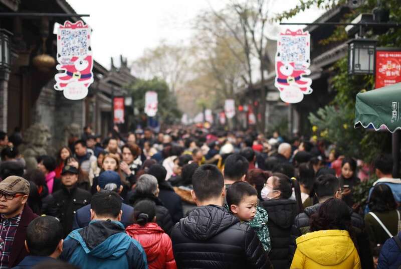 2017年1月28日,农历正月初一,游客在四川成都宽窄巷子景区内参观。