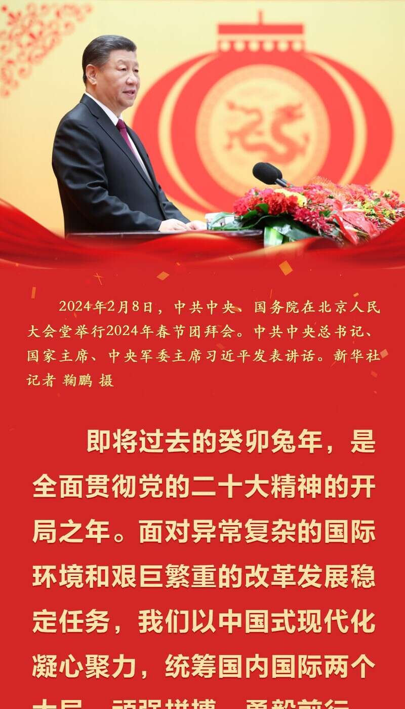 中共中央、国务院2月8日上午在人民大会堂举行2024年春节团拜会。中共中央总书记、国家主席、中央军委主席习近平发表讲话,代表党中央和国务院,向全国各族人民,向香港特别行政区同胞、澳门特别行政区同胞、台湾同胞和海外侨胞拜年。