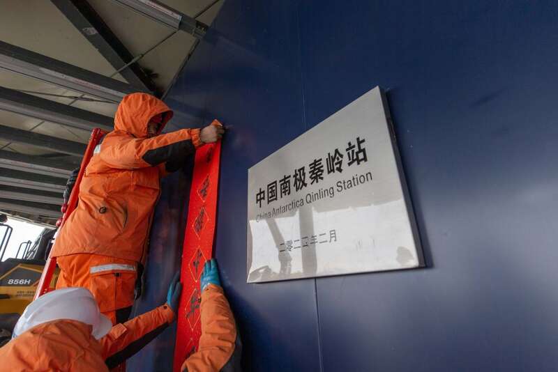 万里之外,祖国的夜已深。在这片冰雪荒原,落日余晖正斜映到秦岭站,红彤彤的对联,艳丽无瑕。(记者周圆)