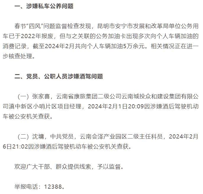 据通报,春节“四风”问题监督检查发现,昆明市安宁市发展和改革局单位公务用车已于2022年报废,但与之关联的公务加油卡出现多次向个人车辆加油的消费记录,截至2024年2月共向个人车辆加油5万余元。相关情况正在进一步核查处理。
