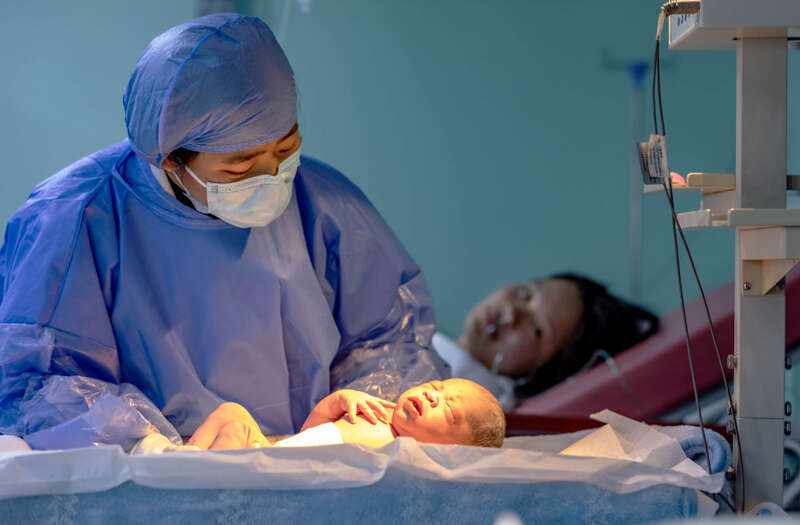 ↑2月10日,在内蒙古乌兰察布市第三医院,医护人员在为一名刚出生的“龙宝宝”做护理。新华社记者 连振 摄