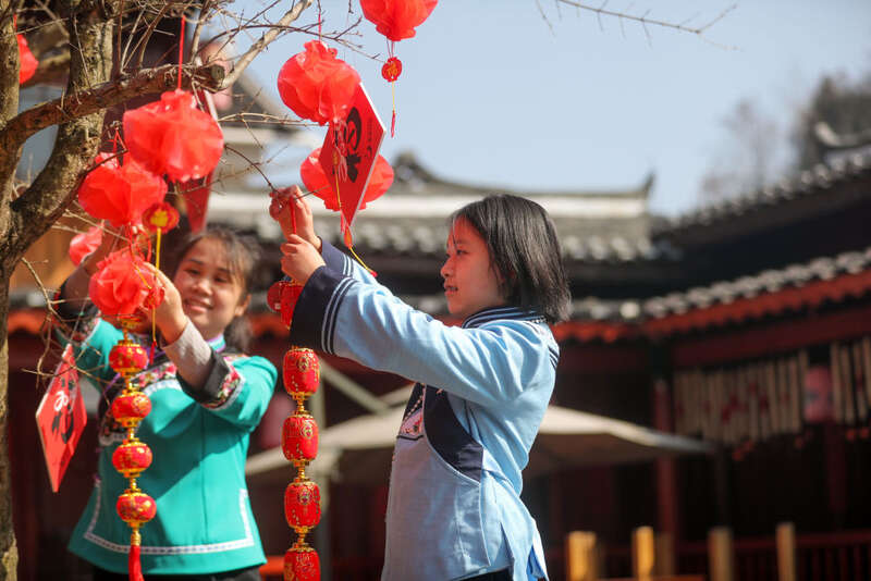 ↑2月10日,在贵州省贵阳市乌当区偏坡布依族乡偏坡村,出生于2012年的“龙宝宝”韦诗颖 (右)和家人一起在院子里挂新春饰品。新华社发(袁福洪 摄)