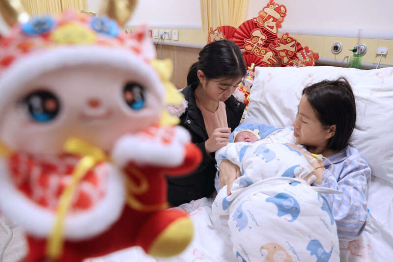 ↑2月10日,在河北省石家庄市妇产医院,一名刚出生的“龙宝宝”躺在妈妈怀里。新华社发(陈其保 摄)