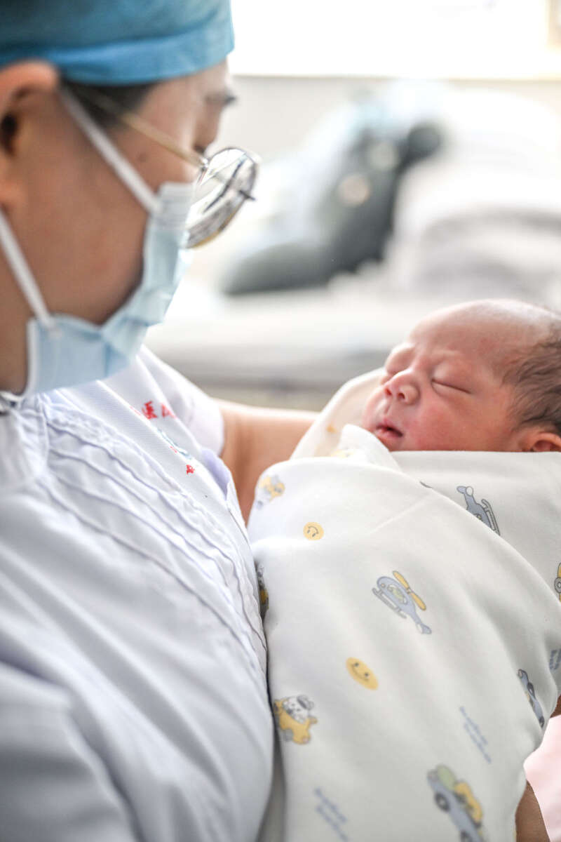 ↑2月10日,在内蒙古乌兰察布市第三医院,医护人员抱着一名刚出生的“龙宝宝”。新华社记者 连振 摄