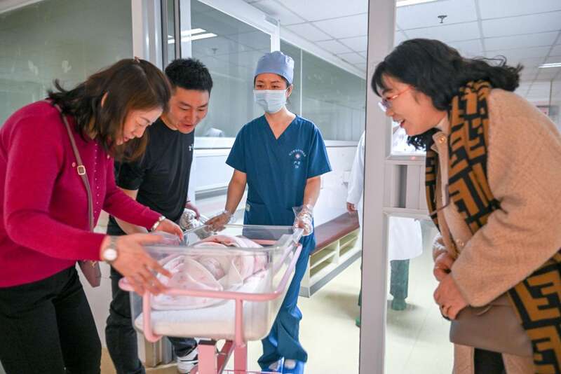 ↑2月10日,在广东省鹤山市人民医院,一名刚出生的“龙宝宝”和家人在一起。新华社发(黄继明 摄)