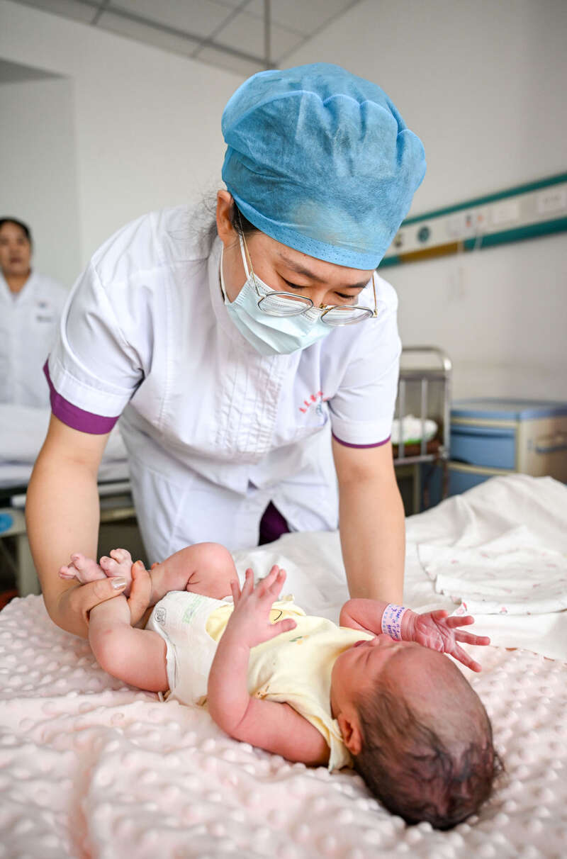 ↑2月10日,在湖南省邵阳市隆回县人民医院,医生在护理一名刚出生的“龙宝宝”。新华社发(范晖 摄)