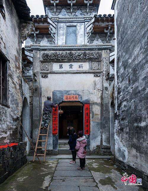 春节将至,国家级传统古村落黄山市祁门县彭龙村 迎新春,贴春联,挂祖容。林坚摄影