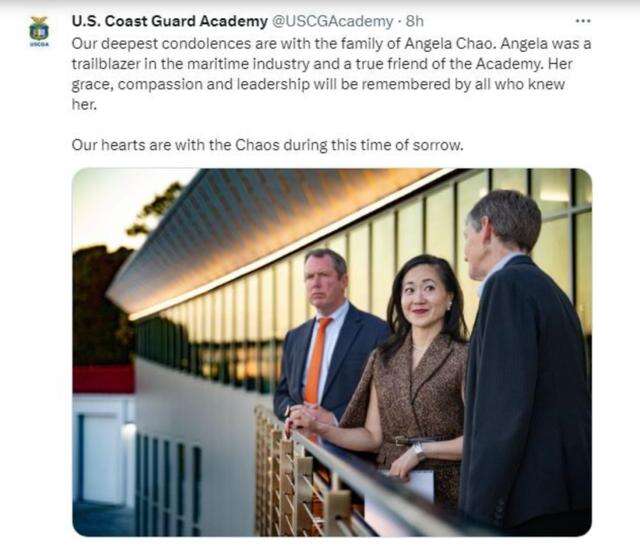 美国海岸警卫队学院也在社交媒体上向赵氏家族表示最深切的哀悼,“安吉是航运业的开拓者,也是我们学院真正的朋友。她的风度、同情心和领导能力将被所有认识她的人铭记。在这个悲伤的时刻,我们的心与赵家同在。”