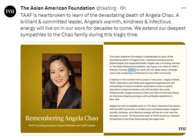 亚裔美国人基金会(TAAF)在社交媒体上发文表示哀悼,“安吉是亚裔美国人基金会的创始成员之一,担任基金会顾问委员会联合主席,她以深刻的价值观、战略眼光和对亚太裔社区坚定不移的承诺指导我们的工作,在亚裔美国人基金会和亚太裔社区留下了不可磨灭的印记。作为一名杰出忠诚的领导者,安吉的温暖、善良和感染力将在未来几十年继续伴随在我们的工作中。在这痛心的时刻,向赵氏家族致以最深切的哀悼。”