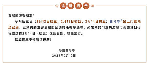洛阳白马寺2月12日、2月13日、2月14日线上门票预约已满;洛阳博物馆2月12日、2月13日、2月14日门票预约已满;洛阳古墓博物馆2月12日、2月13日、2月14日、2月15日门票预约均已满。
