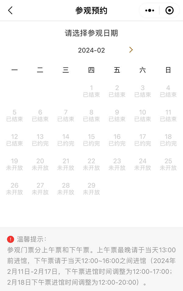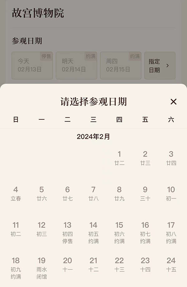 故宫博物院门票预约小程序显示,2月11日(初二)至18日(初九)门票已经全部约满。