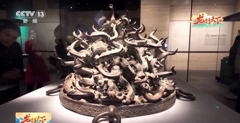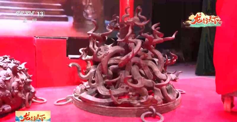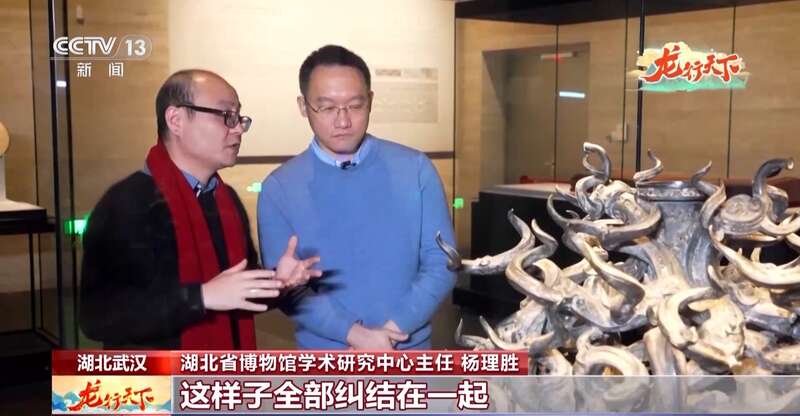 湖北省博物馆学术研究中心主任 杨理胜:建鼓座其实从发掘报告的时候,它就没有把龙有多少数量数清楚,只提到了它有八对主龙。其实在它的躯干上面,又会有一个龙长出来,龙上长龙,这样子全部纠结在一起,不是特别好数。有外国游客过来,想把这个龙有多少条数清楚,数了很多遍,他的结论是108条,但是事实上换一个角度,可能就数的数又不一样了,它是一件孤品。