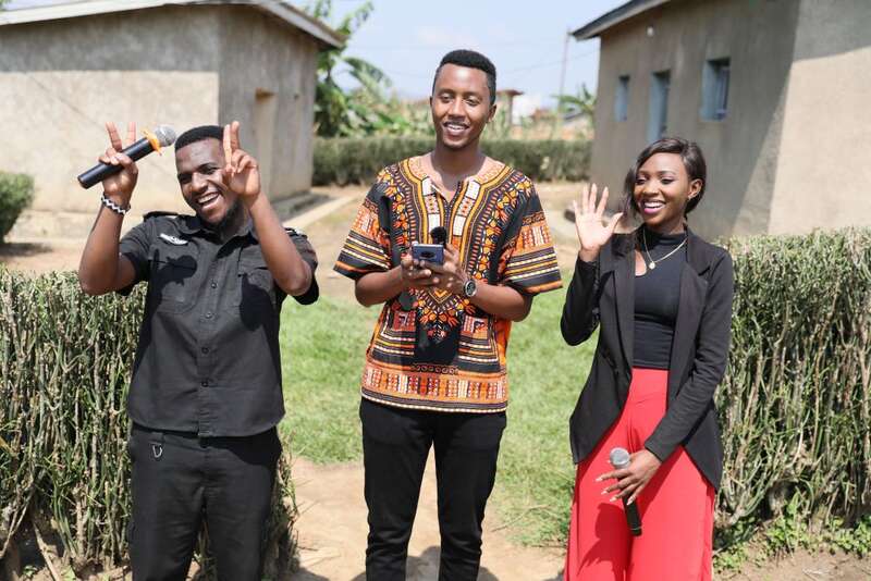 在卢旺达南方省卡莫尼地区,卢旺达青年歌手团队成员“波波”(中)、“保安”(左)、“鑫鑫”在镜头前向网友问好。新华社发(黄万晴摄)