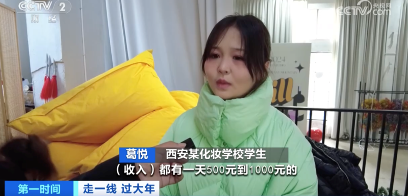 西安某化妆学校学生 葛悦:过年一天收入500元到1000元。