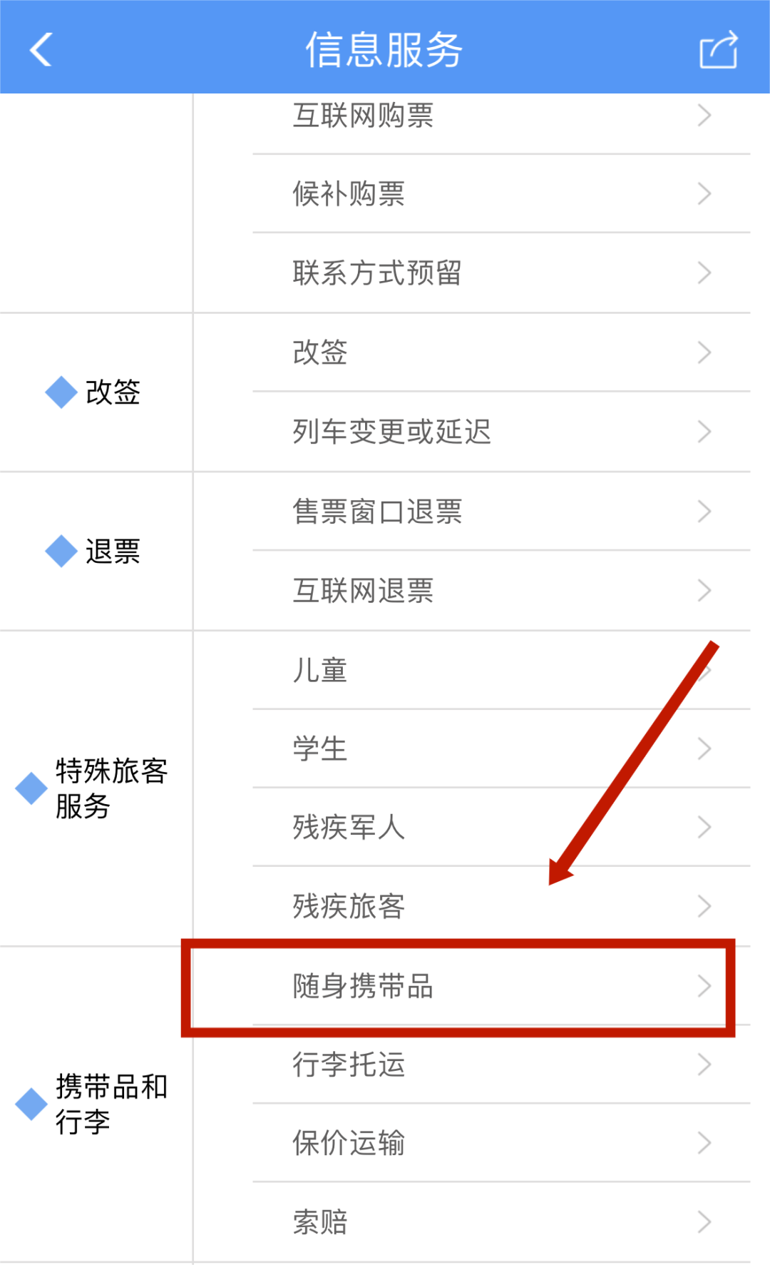 在“信息服务”找到“携带品和行李”