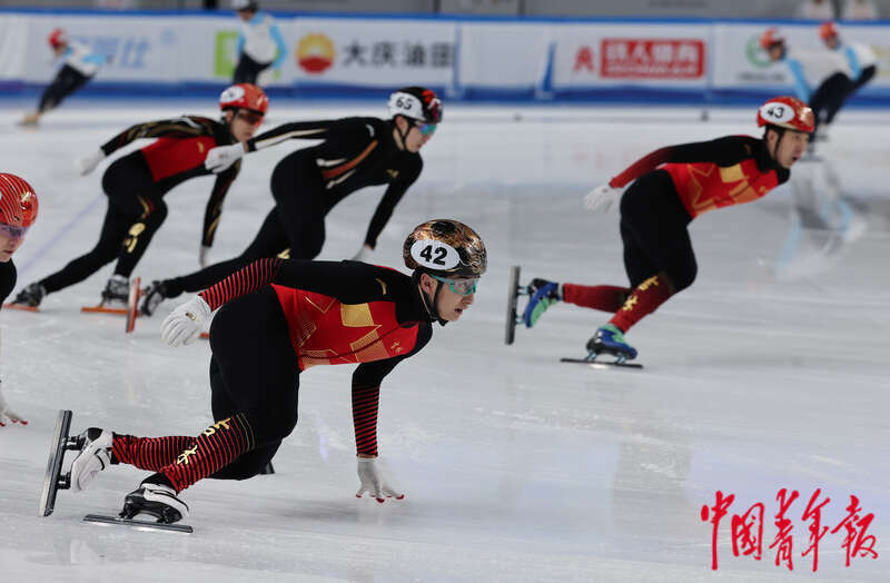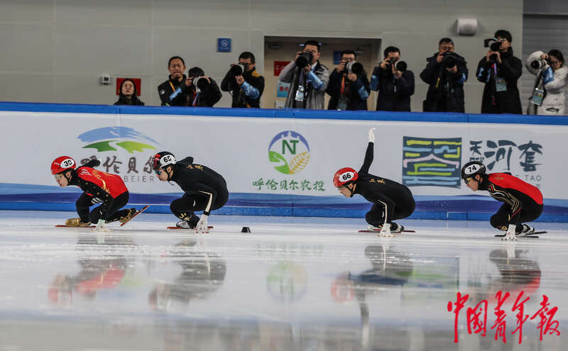 2月17日,内蒙古呼伦贝尔,海拉尔赛区,第十四届全国冬季运动会短道速滑男子500米1/4决赛,选手们在比赛中。中青报·中青网记者 曲俊燕/摄