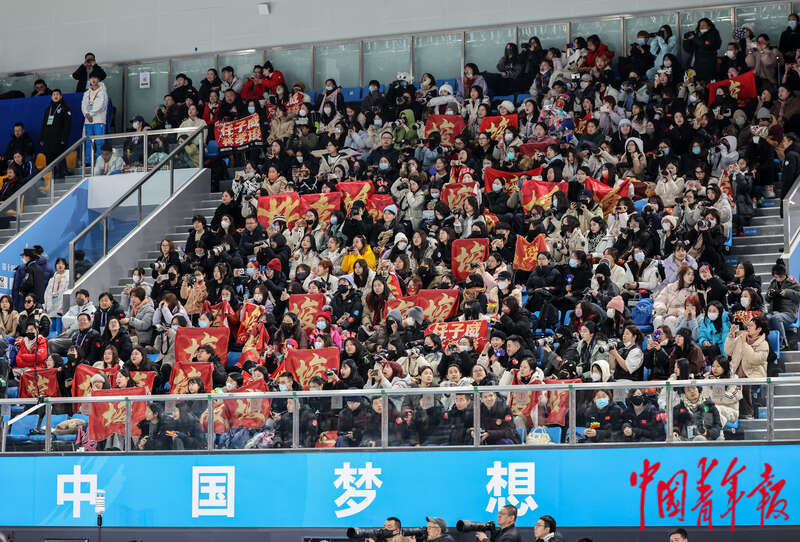 2月17日,内蒙古呼伦贝尔,海拉尔赛区,第十四届全国冬季运动会短道速滑比赛现场,看台上的粉丝举着印有林孝埈、任子威等运动员名字的横幅。中青报·中青网记者 曲俊燕/摄