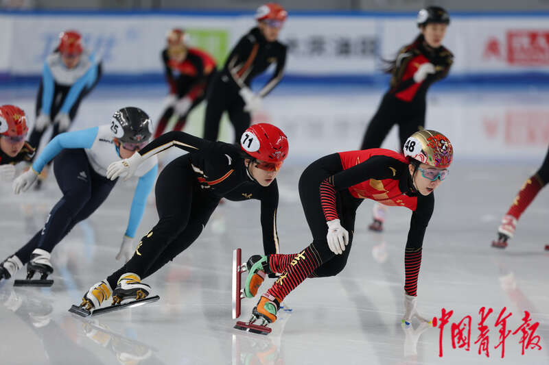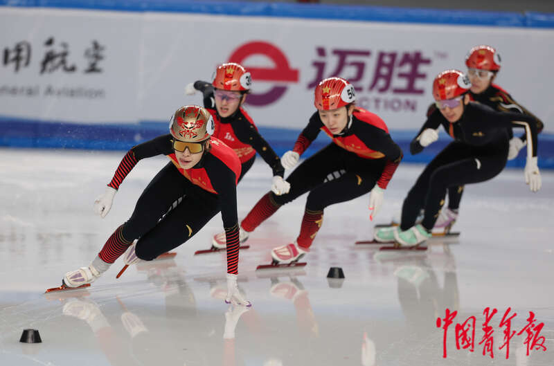 2月17日,内蒙古呼伦贝尔,海拉尔赛区,第十四届全国冬季运动会短道速滑女子3000米接力半决赛,吉林队郭奕含(前排右一)在比赛中。中青报·中青网记者 曲俊燕/摄