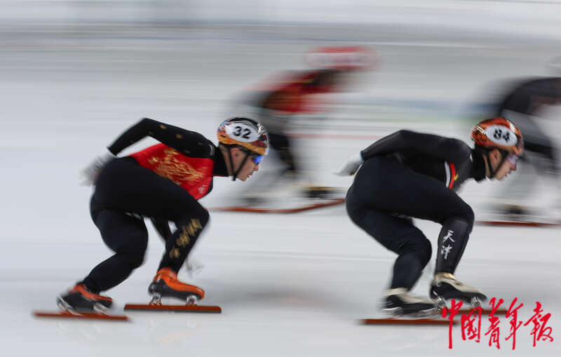 2月17日,内蒙古呼伦贝尔,海拉尔赛区,第十四届全国冬季运动会短道速滑男子500米1/4决赛,天津队刘少昂(前)在比赛中。中青报·中青网记者 曲俊燕/摄