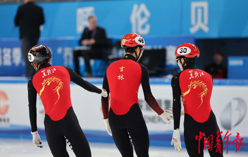 2月17日,内蒙古呼伦贝尔,海拉尔赛区,第十四届全国冬季运动会短道速滑男子500米决赛结束后,吉林队孙龙(中)、黑龙江队钟宇晨(左)和林孝埈互相致意。中青报·中青网记者 曲俊燕/摄