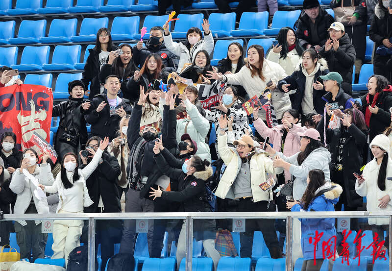 2月17日,内蒙古呼伦贝尔,海拉尔赛区,第十四届全国冬季运动会短道速滑比赛现场,观众抢着接运动员退场时抛上看台的吉祥物。中青报·中青网记者 曲俊燕/摄