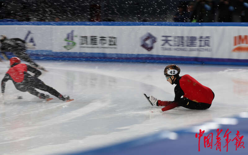 2月17日,内蒙古呼伦贝尔,海拉尔赛区,第十四届全国冬季运动会短道速滑女子500米半决赛第一组,辽宁队55号赵元微在比赛中摔倒,后被判犯规。中青报·中青网记者 曲俊燕/摄