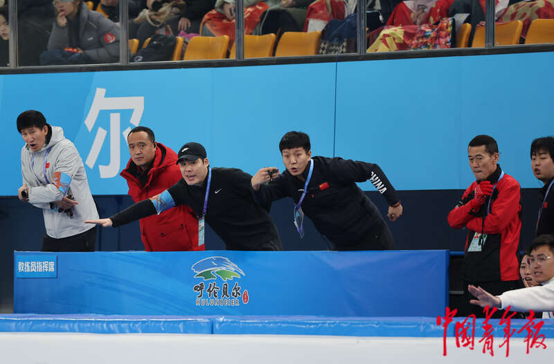 2月17日,内蒙古呼伦贝尔,海拉尔赛区,第十四届全国冬季运动会短道速滑比赛女子3000米接力半决赛,各队教练在场边指挥。中青报·中青网记者 曲俊燕/摄