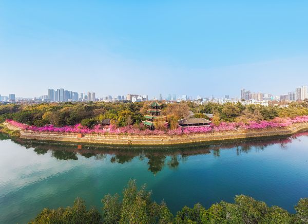 2024年2月17日,成都阳光明媚,锦江河畔望江楼公园红梅绽放。