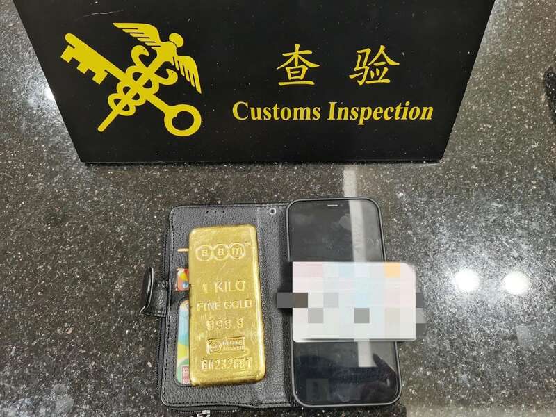 1月29日17时48分,一名身穿白色外套的旅客从青茂口岸旅检现场“无申报通道”进境,现场关员察觉其神色紧张,有逃避海关监管的嫌疑,遂将其截查。经查验,关员发现该名旅客手机的重量异常,随后在其翻盖式手机壳夹层内查获一块用黑色纸包裹的金块,重量为1千克。目前该案已按规定移交缉私部门处理。