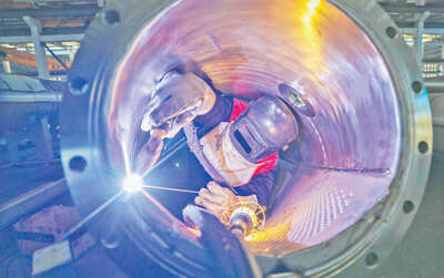 2月18日中午,在河南省信阳市袁湾水库工程建设工地,工人们施工正酣,防渗墙钢筋焊接施工现场焊花四射。不远处的道路上,工程车来回穿梭,一派忙碌景象。