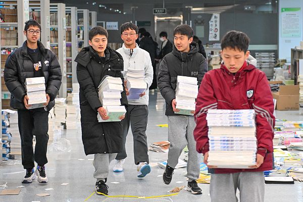 2024年2月20日,苏州,昆山市开发区青阳港学校,学生们元气满满领书做开学准备。
