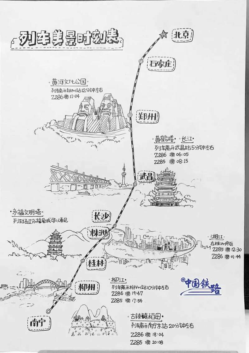 邓娟娟和同事专门绘制了列车美景时刻表,把沿途经过的各景点标注到达时间及方位。经过一些小众的美景,她还会给大家介绍介绍。