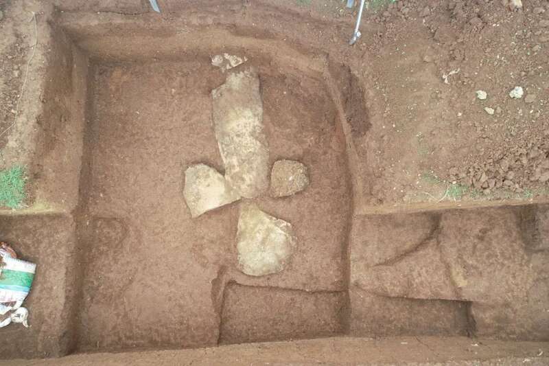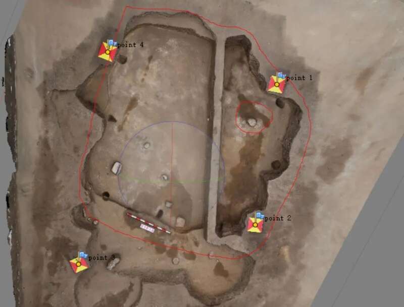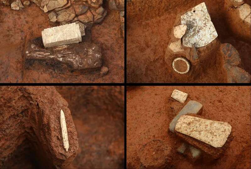△ 随葬玉器出土现场(玉琮、玉钺与玉环、玉锥形器、玉钺)