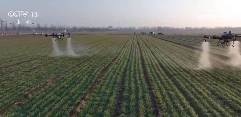 在河南安阳市滑县,农户们也在忙着春季田间管理。在滑县留固镇李周村,植保无人机正在向连片小麦喷施叶面肥,促进小麦返青。