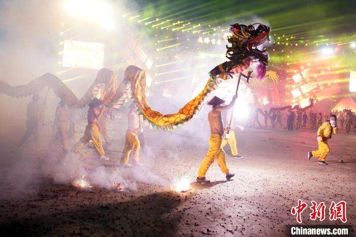 中新社南宁2月20日电 题:中外游客体验广西千年习俗舞“炮龙”