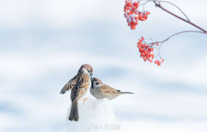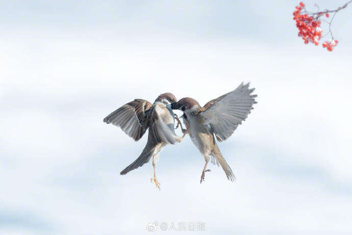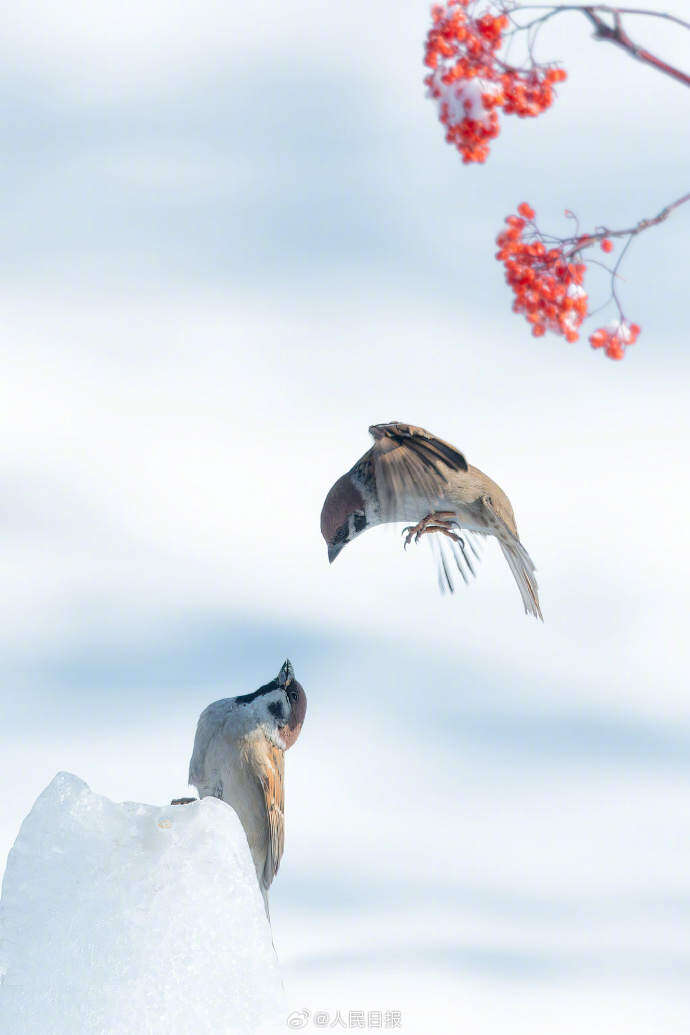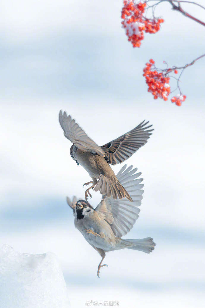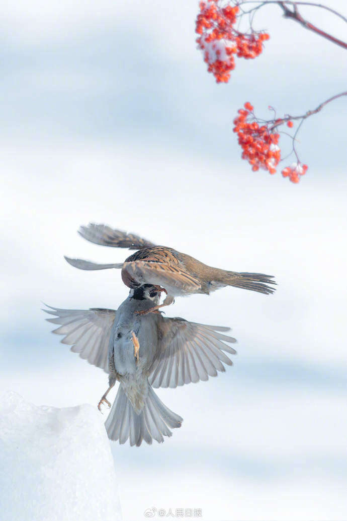 近日,黑龙江大庆市城市森林公园,红果点缀白雪,小鸟在冰雪中打斗嬉戏。画面素雅别致,灵动可爱。