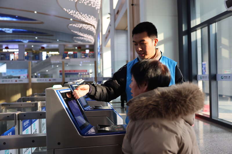 售票厅内,青年志愿者蒋金成刚刚帮助旅客通过自助设备打印乘车通知单,“今年是我入路的第一年,也是我经历的第一个春运,利用休班时间参与志愿服务,不仅能够帮助他人,而且也学到了自己从事的调车岗位之外的客运知识,成就感满满。”