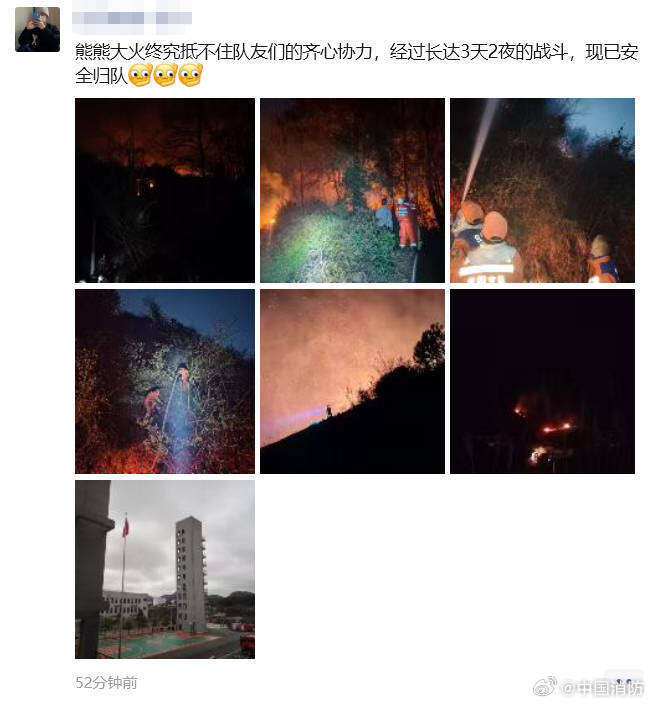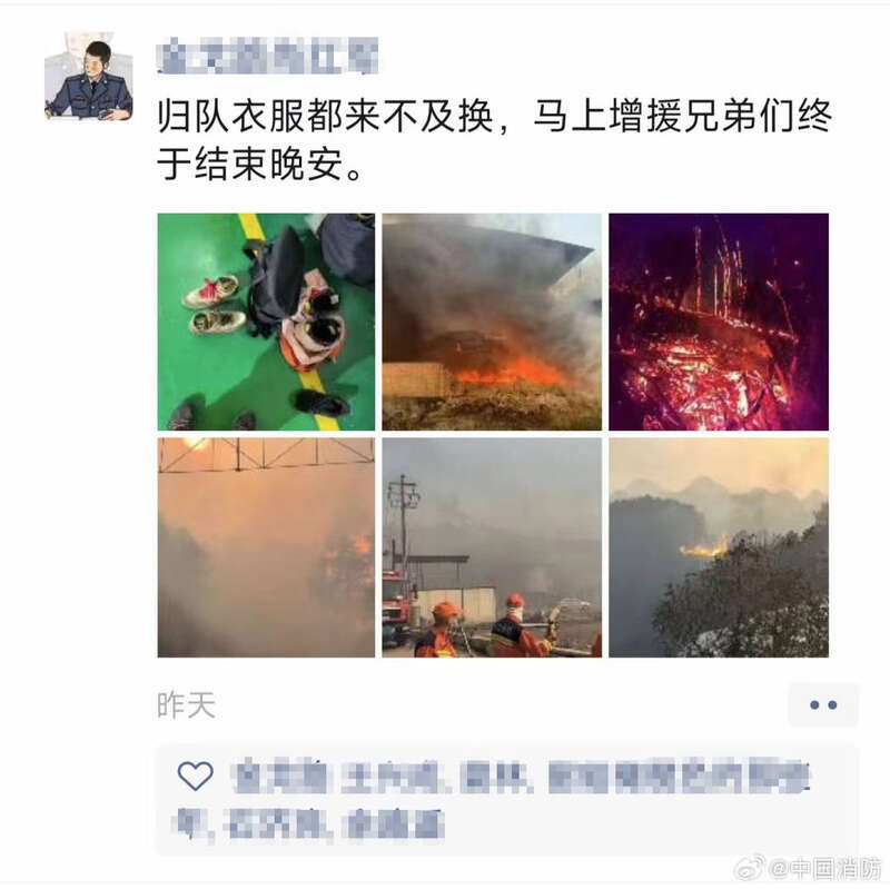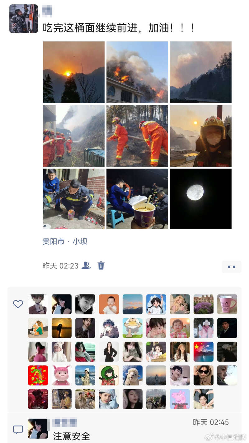 “熊熊大火终究抵不过队友们的齐心协力”“前方是山火,身后是万家灯火,绝不能退!”“两天一夜后的第一顿早餐”.......这是贵州山火救援一线消防员朋友圈,这也是他们神同步设置为家人不可见的朋友圈,看破防!愿山火早日消散,所愿皆平安!