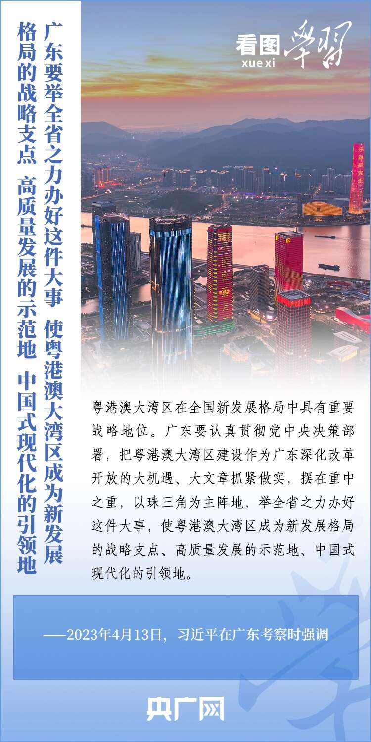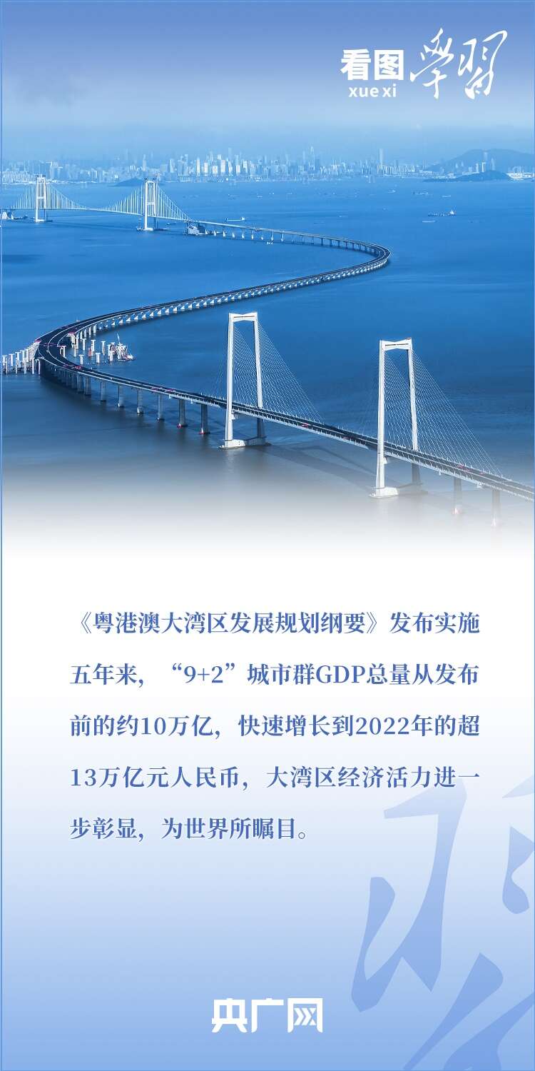 2019年2月,《粤港澳大湾区发展规划纲要》正式发布。五年来,习近平总书记多次作出重要部署和深刻阐述,引领推进粤港澳大湾区高水平建设。总书记强调,要使粤港澳大湾区成为新发展格局的战略支点、高质量发展的示范地、中国式现代化的引领地。一起来学习!