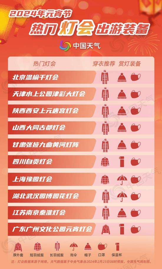 不过花灯虽美,观赏时也要做好保暖和健康防护。元宵节当天,北方大部地区天气利于赏灯,但最低气温普遍在冰点以下,山西大同甚至低于-10℃,寒意十足,有外出赏灯计划的朋友建议穿上长款羽绒服保暖;南方体感普遍湿冷,上海、湖北武汉、江苏南京、四川自贡的朋友也需羽绒服护体,上海、武汉、南京还将伴有降水,容易出现道路积雪或结冰现象,待在家中“云赏灯”也是不错的选择;广东广州体感会舒适很多,全天气温都在10℃以上,外出赏灯的朋友穿件厚外套足矣。此外,元宵节赏灯时人员密集,容易形成交叉感染,建议各位佩戴好口罩,避免扎堆,做好健康防护和安全工作。