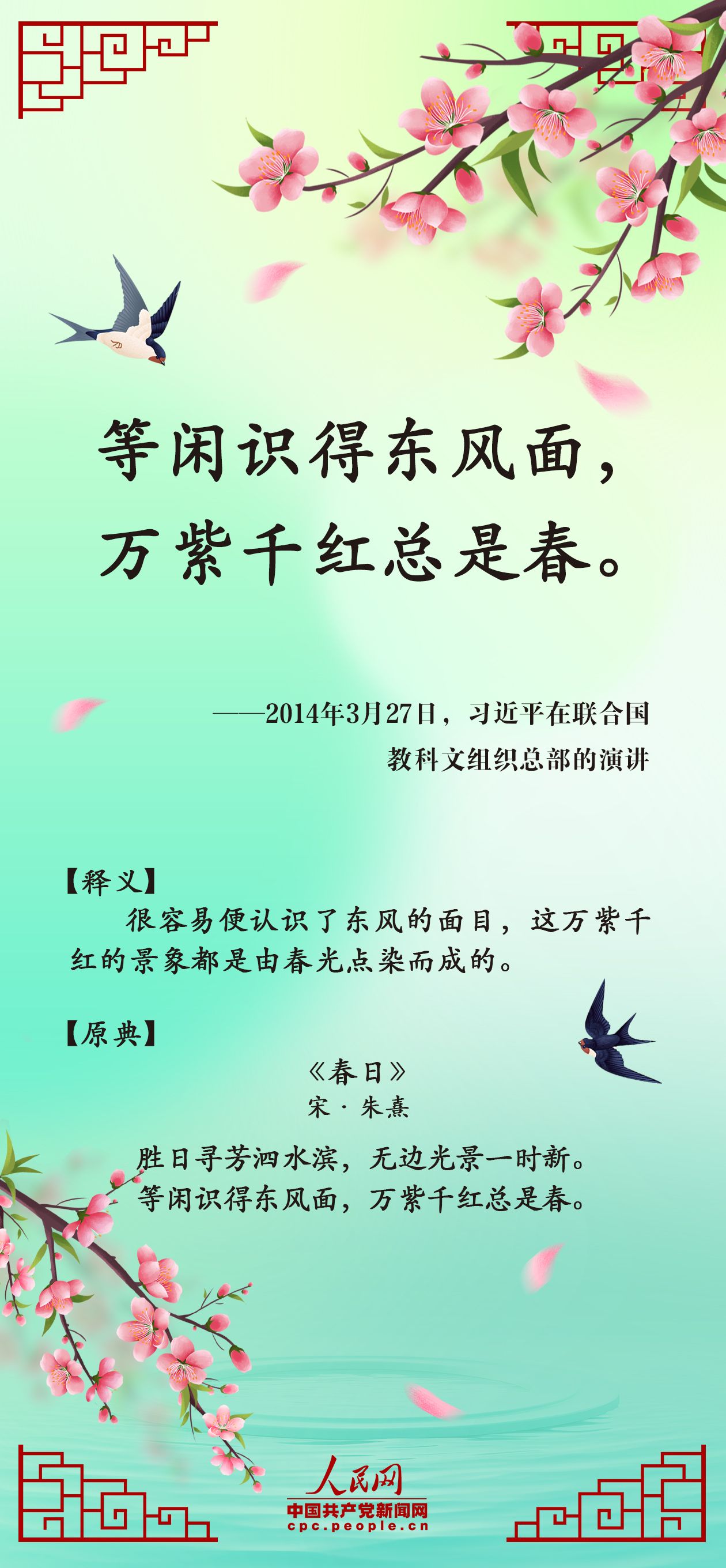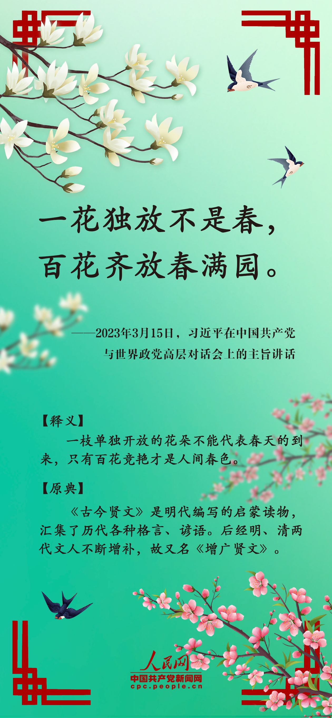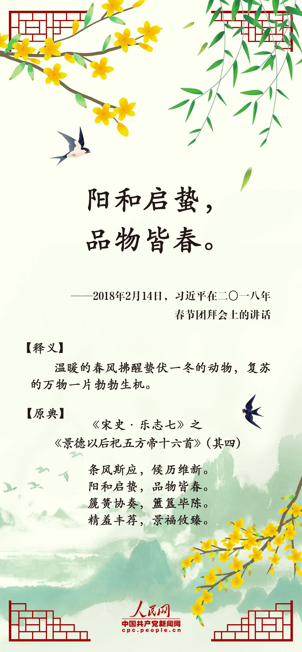 春是新的开始,是万物生发、欣欣向荣的美好时节。习近平总书记曾多次引经据典,用诗文名句展现生机盎然的春天景象。一年之计在于春,一起领会中华传统文化的深刻内涵,凝聚蓬勃向上的发展之力。
