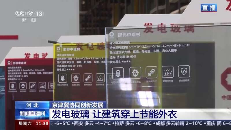 总台央视记者 杨海灵:京津冀协同发展,河北提出要在对接京津、服务京津中加快发展自己。今天就从我手上拿的这块玻璃说起。它并不是一块普通的玻璃,它是一块碲化镉薄膜玻璃。它的结构好比“三明治”,在两块超白高透的玻璃之间,均匀喷涂一层4微米厚的碲化镉,也就是黑色的涂层。虽然只有头发丝的二十分之一,但当太阳光照射到薄膜层后会产生电子运动,所以这块玻璃的神奇之处就在于,它可以发电。