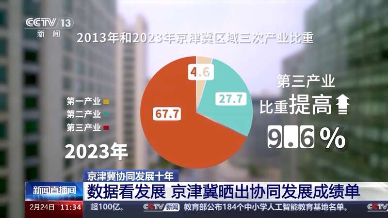 总量提升的同时,三地产业结构也在持续升级。京津冀三次产业构成由2013年的6.2:35.7:58.1变化为2023年的4.6:27.7:67.7,第三产业比重提高9.6个百分点。其中,北京三产占比保持在八成以上,天津占比超六成,河北突破五成且提升最快,三地三产比重较2013年分别提高5.3个、8.6个和11.4个百分点。