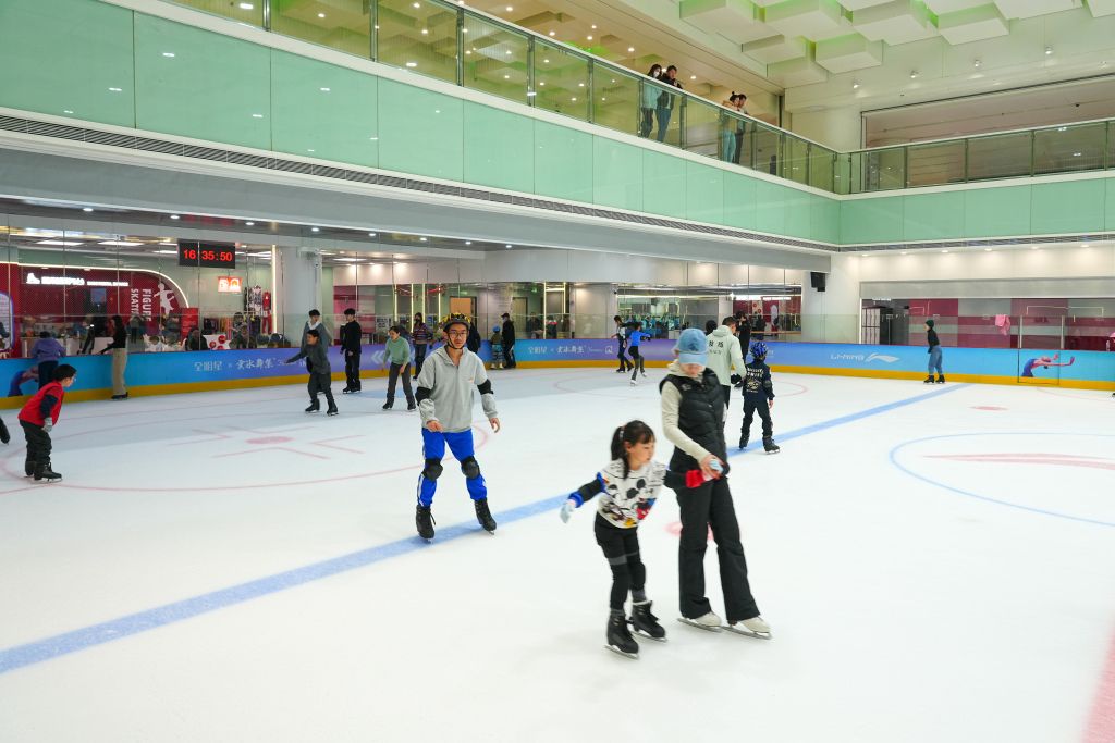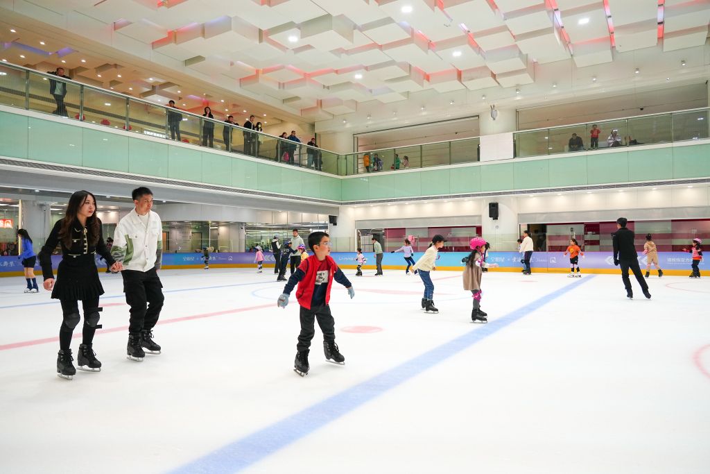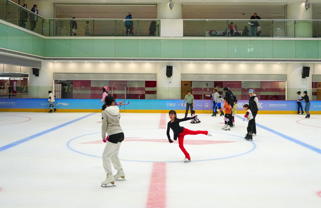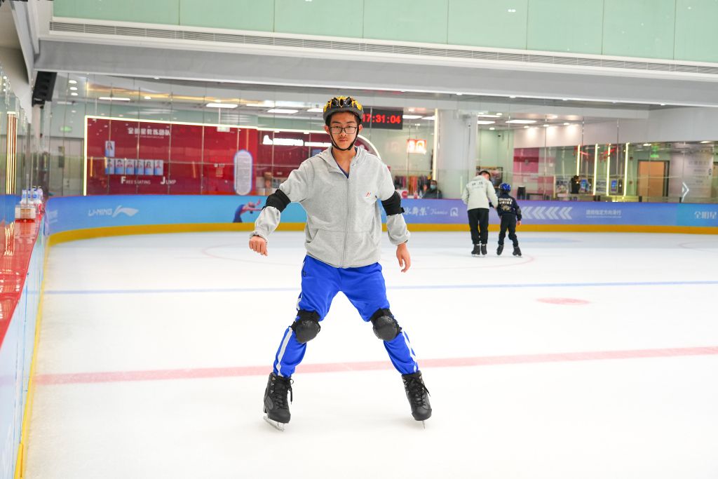 2024年2月24日,北京,周末节假日青少年到室内冰场练习滑冰,体验体育冰雪运动。