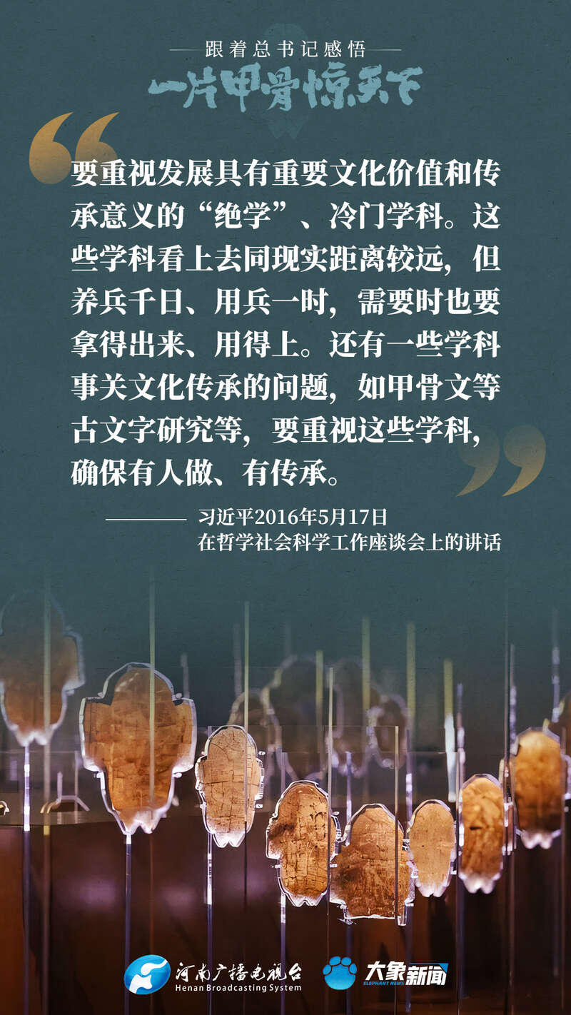 党的十八大以来,习近平总书记多次就殷墟和甲骨文保护研究利用工作作出重要讲话重要指示,为我们坚定文化自信,传承发展中华优秀传统文化提供了根本遵循。大象新闻邀您一起回顾、学习。