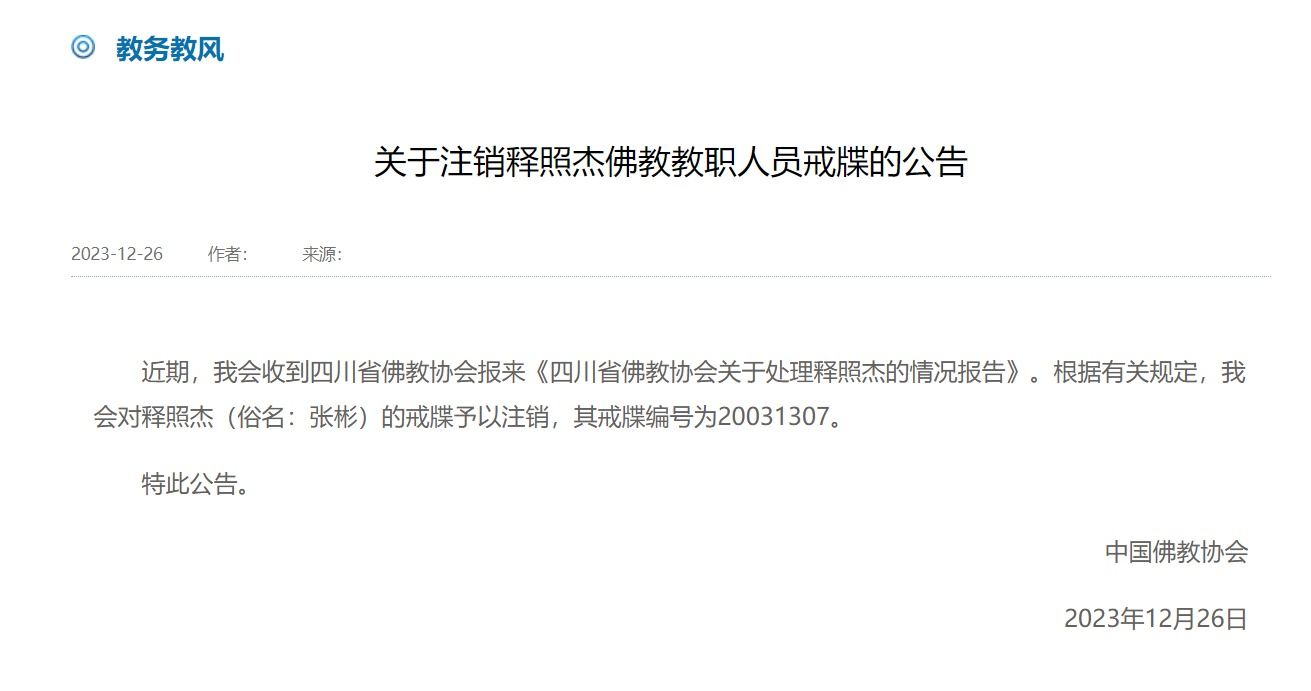 2023年12月26日,中国佛教协会网站发布《关于注销释照杰佛教教职人员戒牒的公告》称,“近期,我会收到四川省佛教协会报来《四川省佛教协会关于处理释照杰的情况报告》。根据有关规定,我会对释照杰(俗名:张彬)的戒牒予以注销,其戒牒编号为20031307。”